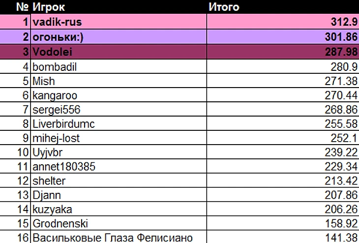 * Не забываем поздравлять чемпионов турнира в коментариях к посту ведь на их месте в любой момент можете оказаться и вы  :)