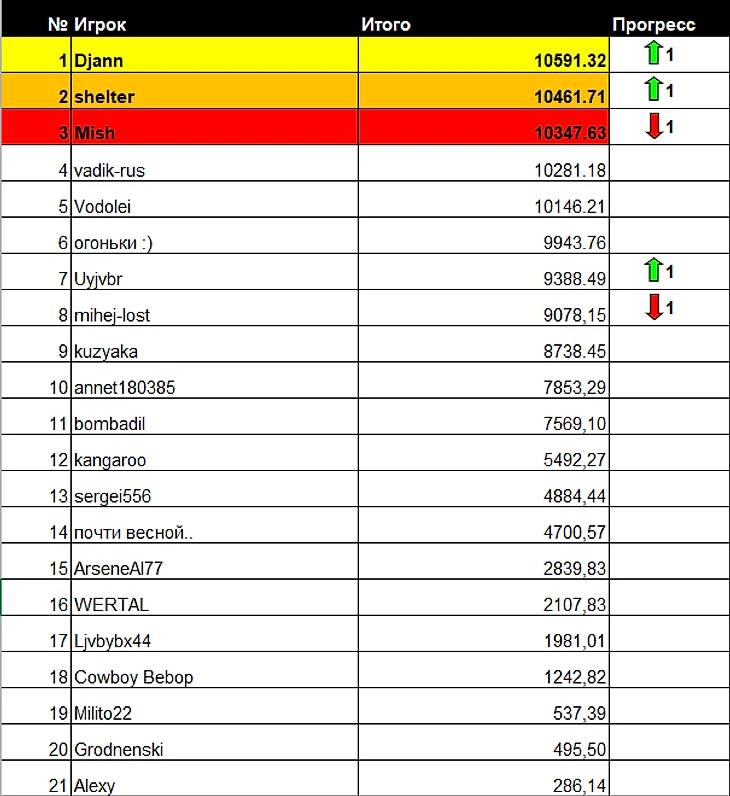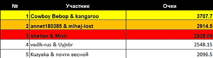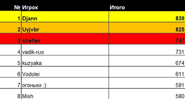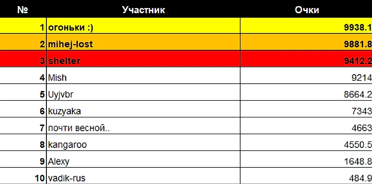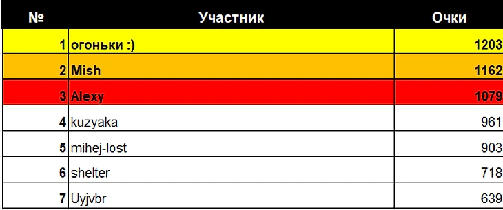 Забавно получилось, тот, кто выиграл итоговый, забирает и первую строчку, ну что же, это вполне закономерно и заслужено) Поздравляю!