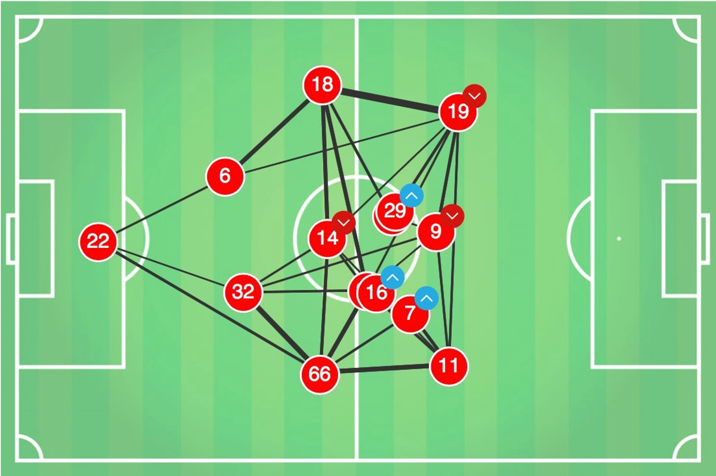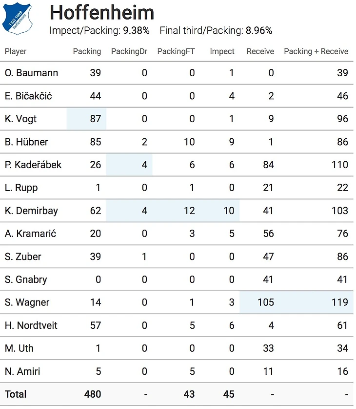 Перед вами Packing-статистика Хоффенхайма в матче. Packing - количество игроков соперника, отрезанных передачами. Подробно можете узнать в видео от самих создателей этого показателя.