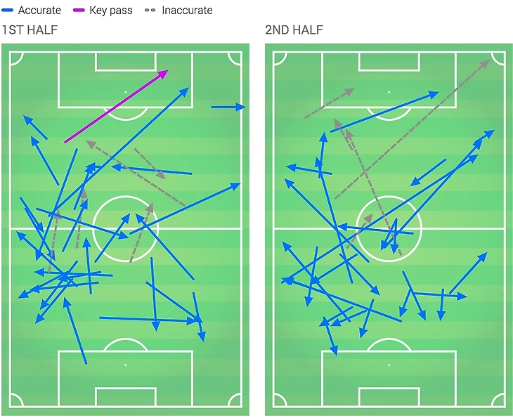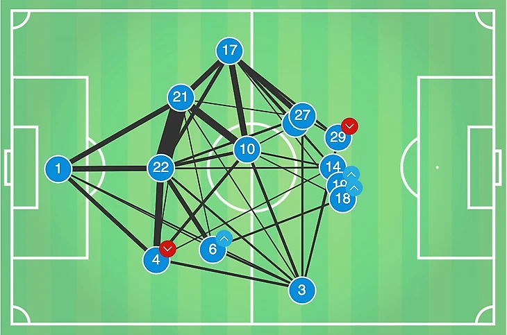 И теперь картина становится не такой радужной. Самая частая комбинация в игре Хоффе – те самые Фогт с Хюбнером, 59 передач. Немцы были вынуждены долгое время катать мяч на своей половине поля в ожидании открывания крайних полузащитников или Керема Демирбая, попутно набивая пэкинг отрезаниями первой волны прессинга, и возвращая мяч обратно.
