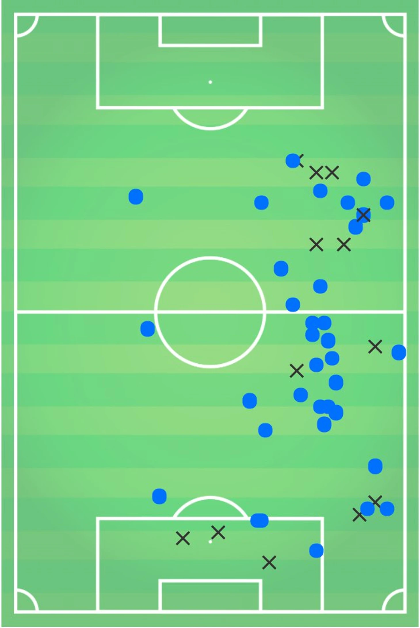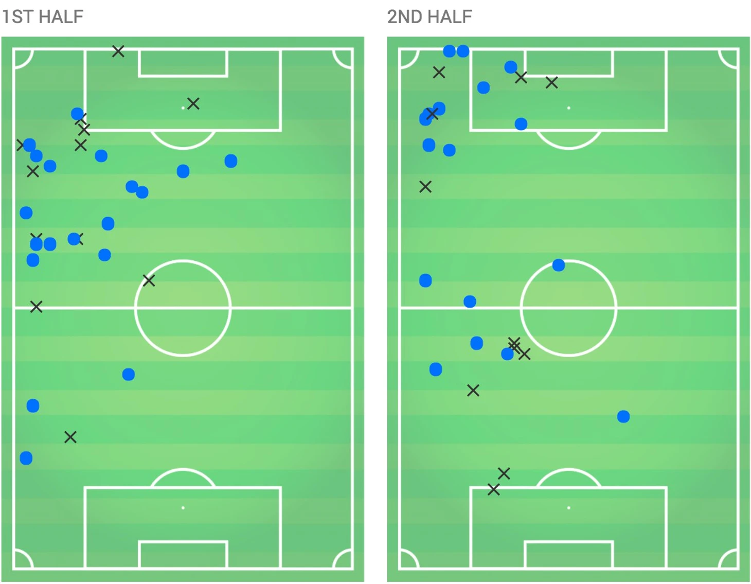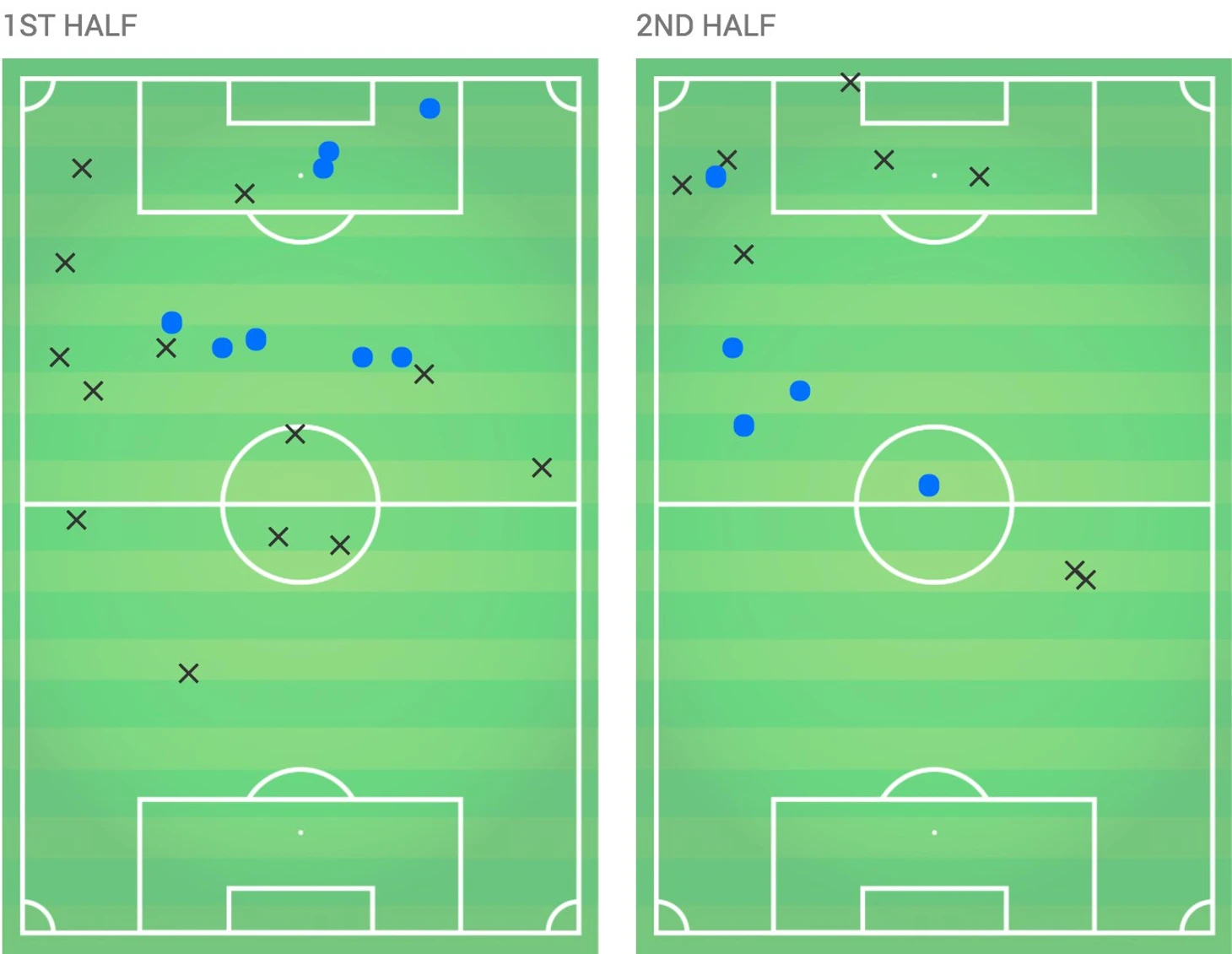 После матча Юлиан Нагельсманн сказал «У нас было больше голевых моментов. Я бы сказал, что сегодня мы были не хуже соперника, просто нам меньше повезло». Карта xG частично опровергает это мнение – голевых моментов было столько же, однако, разница 0.39 xG с учётом не реализованного пенальти намекает как минимум на ничью.