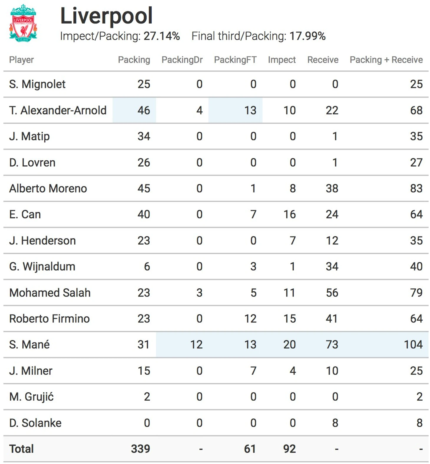 Packing-статистика полностью соответствует схеме передач. В двух самых сильных связях Ливерпуля Александер-Арнольд - Салах и Морено - Мане отправители имеют самый большой показатель Packing, а адресаты соответственно Receive.