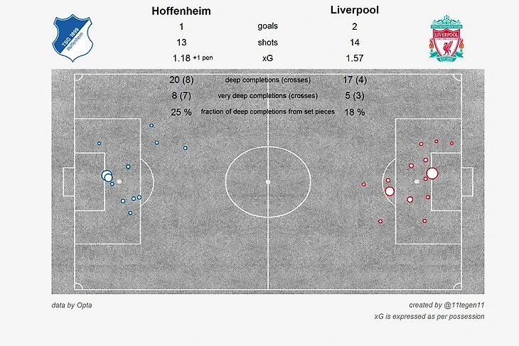 Для понимания, насколько 9% PackingFT/Packing маленький показатель, сразу спойлерну, что Ливерпуль набрал 18%. Почему так вышло? Повторюсь, что по моему мнению Хоффенхайм не был готов к такой игре не только физически, но и тактически.