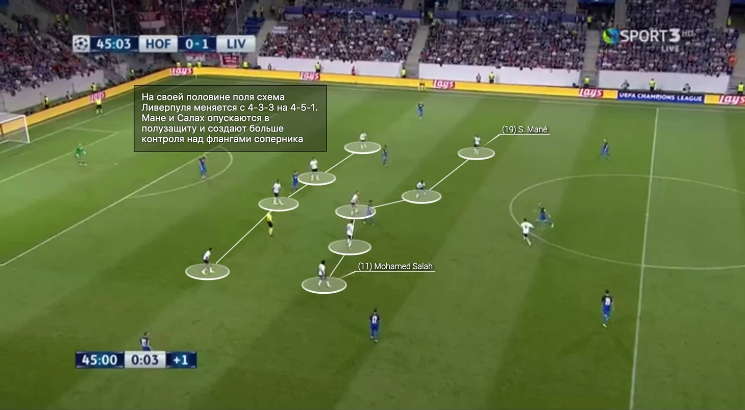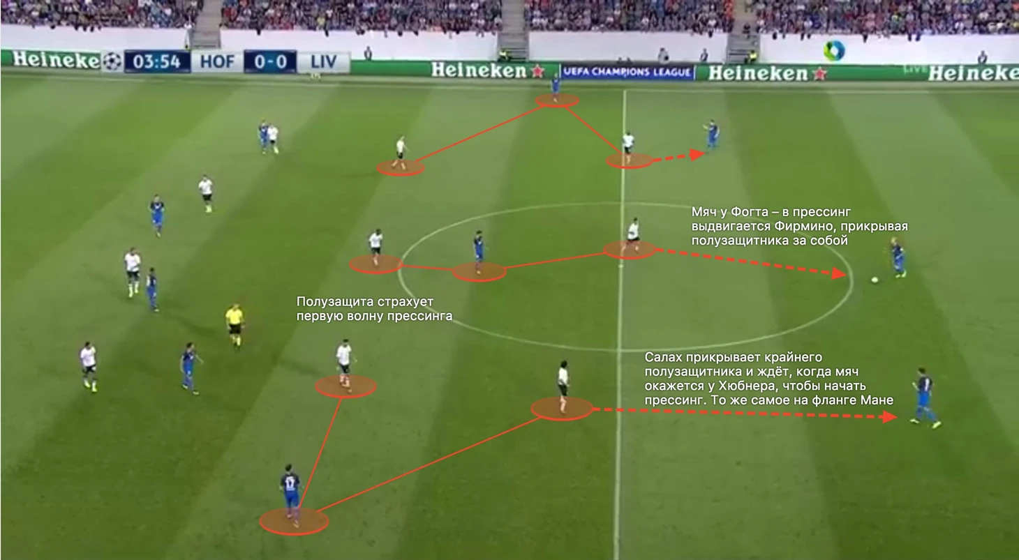 При спокойном розыгрыше Хоффенхайма на своей половине поля Ливерпуль прибегал к скорее сдерживающему прессингу. Тройка центральных защитников была персонально разобрана Мане, Фирмино и Салахом, причём эти ребята выходили встречать своего визави только когда тот получал мяч. Остальное время они прикрывали полузащитников позади себя. Ливерпулю сыграло на руку то, что в атаке Хоффенхайм играл с ромбом в полузащите, обратите внимание на положение Демирбая и Руппа. Линия полузащиты страховала атакующую тройку – если и как только мяч проходил первую волну прессинга, страхующий сразу выбрасывался на опекаемого игрока, которому этот мяч шёл. Вдобавок к этому на помощь всегда возвращался игрок атаки, через которого прошла передача.