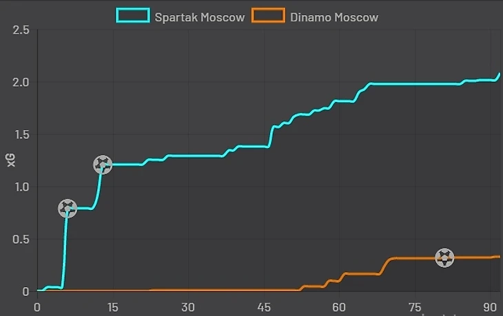 4. Спартак-Динамо. (2-1) xG-2,288-0,33 Столичное дерби началось с сущего кошмара для Динамо. 2-0 к 14-й минуте и ровным счетом никаких шансов в атаке за весь первый тайм. Да и второй запомнился только чудо-курьезом имени Максименко, что не помешало Спартаку уверенно победить. 3 очка в Тушино оставляем.
