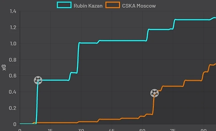 3. Рубин-ЦСКА (1-1) xG- 1,32-0,825 Рубин быстро забил Акинфееву и весь первый тайм достаточно успешно мешал ЦСКА отыграться. Во втором тайме приемущество "армейцев" было более весомым и логичный ответный гол. Отмечу обе комбинации, которые привели к голам- это было очень красиво. А так, Рубин создал чуть больше xG, но не настолько, чтобы побеждать. Справедливая ничья и по 1 очку командам.