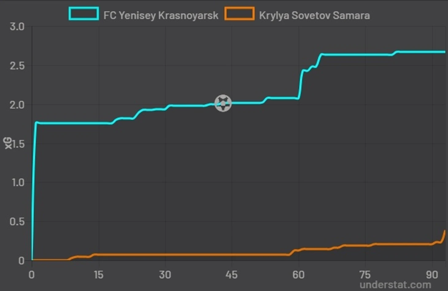 8. Енисей- Крылья Советов (1-0) xG- 2,403-0,351 Последний матч тура смотрелся с трудом. И пусть Вас не вводит в заблуждение высокие xG Енисея- 1,75 из всего енисеевского xG был создан на 1-й же минуте матча, когда Конюхова дважды расстреливали в упор. Весь остальной матч- вялое перекатывание мяча. Моменты у ворот Крыльев стали возникать только во второй половине второго тайма, когда самарцы побежали отыгрываться и оголили тылы. Но забить Енисей больше так и не смог- подводило исполнительское мастерство. Еще один довод в пользу того, почему я дисконтирую xG новичков Лиги до 0,9. Сами же Крылья не создали за весь матч вообще ничего убедительного. Пока очень хорошие игроки Алиничев и Тихонов не стали хорошими тренерами. Ну а так, победа Енисея и 3 очка в Красноярск.