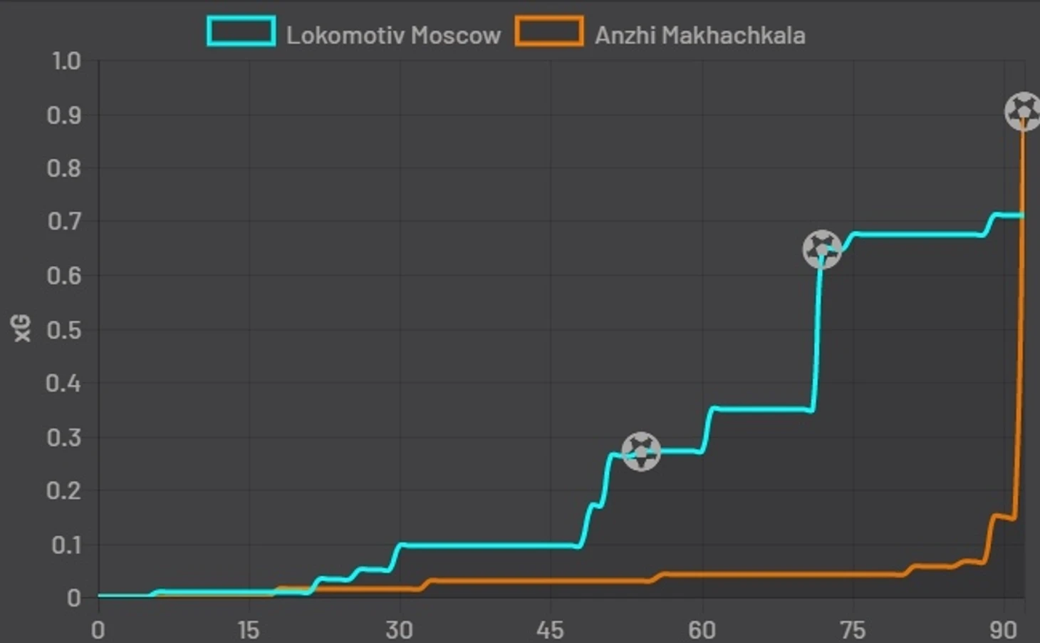 7. Локомотив-Анжи (2-1) xG- 0,781-0,81 Локомотив, по прежнему не в порядке. Первый тайм против абсолютного аутсайдера Лиги выдался совершенно скучным. Обе команды практически не создавали моментов. Во втором Локо оживился, забив дважды, отмечаем первый год Федора Смолова за Локомотив. Анжи...весь xG за счет пенальти и все та же абсолютная безнадега в атаке. 3 (ТРИ!) проникновения пасом в 18 метровую соперника за ПЯТЬ матчей... Однако и Локо, по цифрам на победу не наиграл. Ничья и по 1 очку.