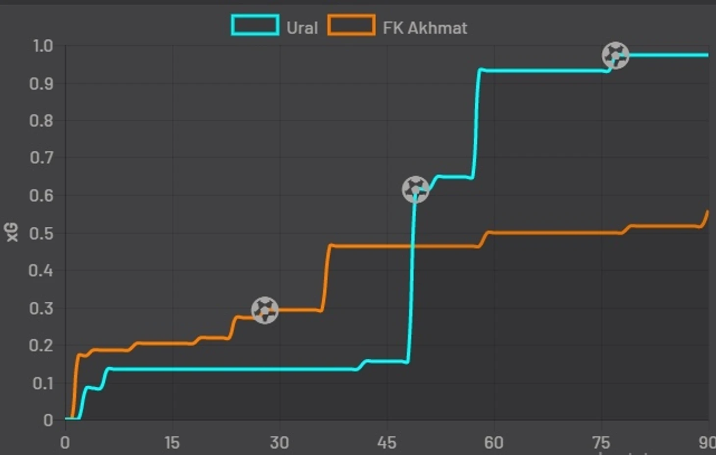 2. Урал-Ахмат (2-1) xG-0,97-0,56. Урал на старте Чемпионата потерял очень много "справедливых" очков. Напомню, екатеринбуржцы после 4-х туров имели разницу -4 от справедливого. Этим матчем Урал начал сокращать свое отставание. Ничейный по xG матч закончился их победой. 1 очко в Екатеринбург.