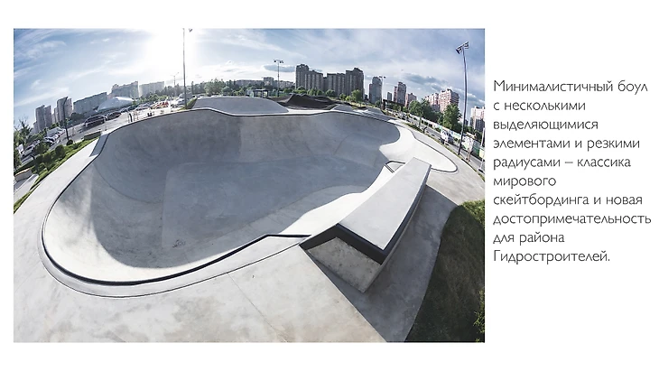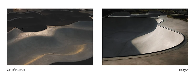 Пространство включает в себя 2 бетонных зоны – боул средних размеров и снейк-ран. Обе – услада для ценителей радиусного катания, как для профессионалов, так и для тех, кто только начинает своё знакомство с этими видами спорта.