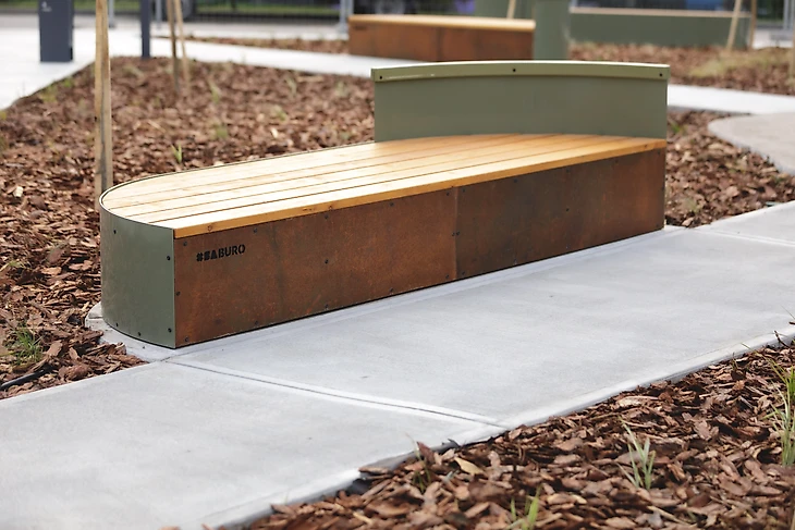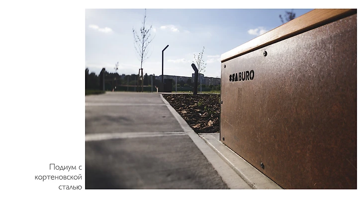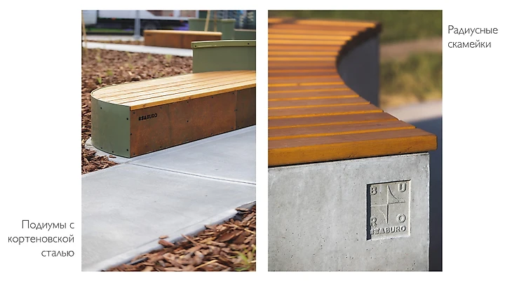 Радиусные скамейки из бетона и широкие подиумы с фасадной частью из кортеновской стали расставлены таким образом, что каждое посадочное место имеет свой вид и не приходится сидеть напротив других посетителей. Тактильность покрытия скамеек обеспечена натуральной термодоской из лиственницы, тонированной качественным масло-воском.