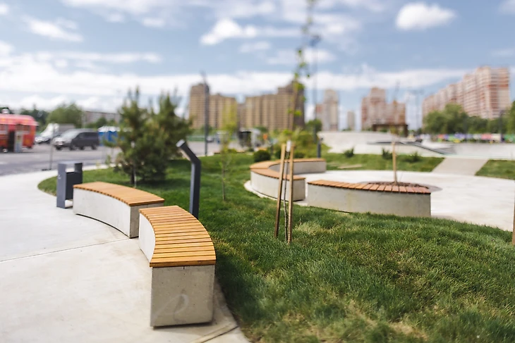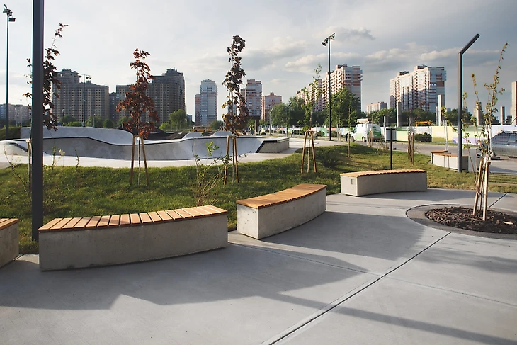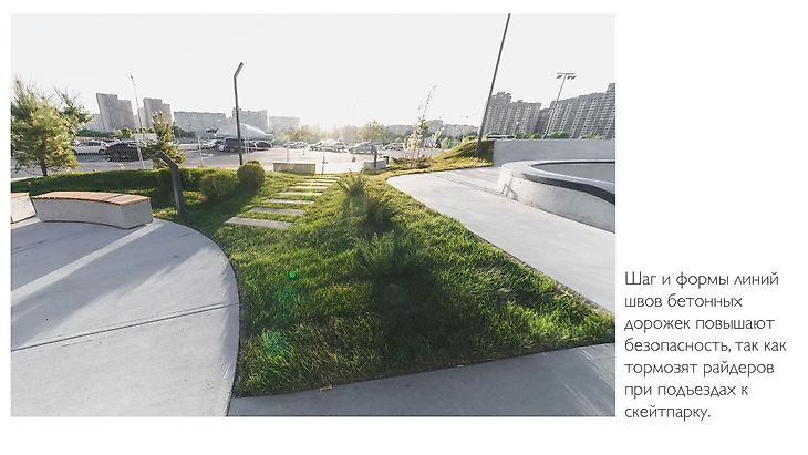 В этом проекте мы сфокусировались на деталях и акцентах. Решения по планировке зон отдыха были продиктованы планировкой скейтпарка, таким образом мы смогли выделить две зоны: широкий тротуар с вело-паркингом, регулярной планировкой и подиумами, и более приватная зона с радиусными формами дорожек и скамеек.