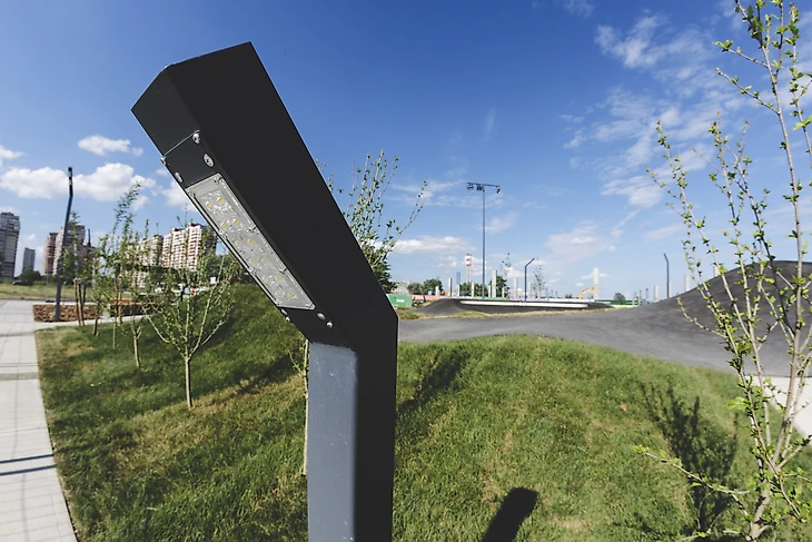Другие элементы благоустройства, такие как стандартные опоры освещения и готовые урны для мусора, были выкрашены в один цвет.