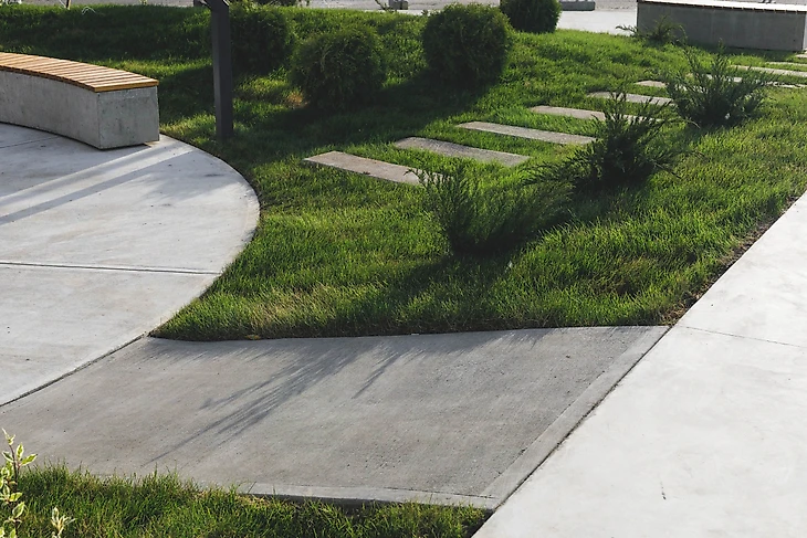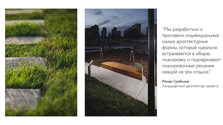 Растения и ландшафтные покрытия так же акцентируют каждую из зон: широкие площади злаковых многолетников на фоне натуральной древесной мульчи с солитерными деревьями «спорят» с групповыми посадками на газонах с шаговыми дорожками из отдельных бетонных блоков.
