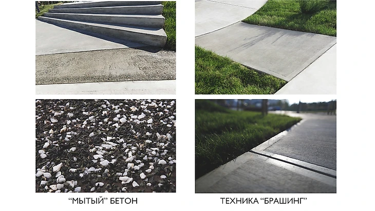 Пролеты дорожек имеют шероховатую поверхность в технике «брашинг» - что исключает скольжение и дополнительно направляет сброс воды с покрытий.