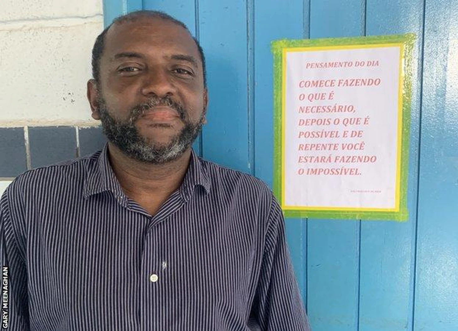 Ари Сантьяго. Табличка на двери гласит: "Начни с того, что необходимо; затем делай, что возможно; и вдруг ты делаешь невозможное".