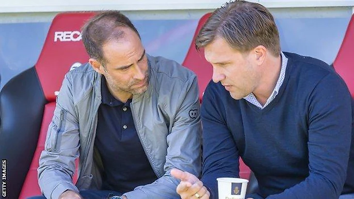 Спортивный директор Маркус Кроше (справа) говорит с исполнительным директором РБ Лейпциг Оливером Минтцлафом