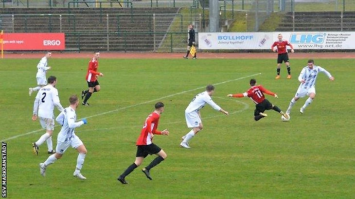 Новая команда в Маркранштадте - SSV Markranstadt в красном - продолжает играть на Stadion am Bad. Они играют в Landesklasse Север - региональной лиге седьмого дивизиона немецкой футбольной пирамиды. На февральском матче посещаемость составила 30 человек.