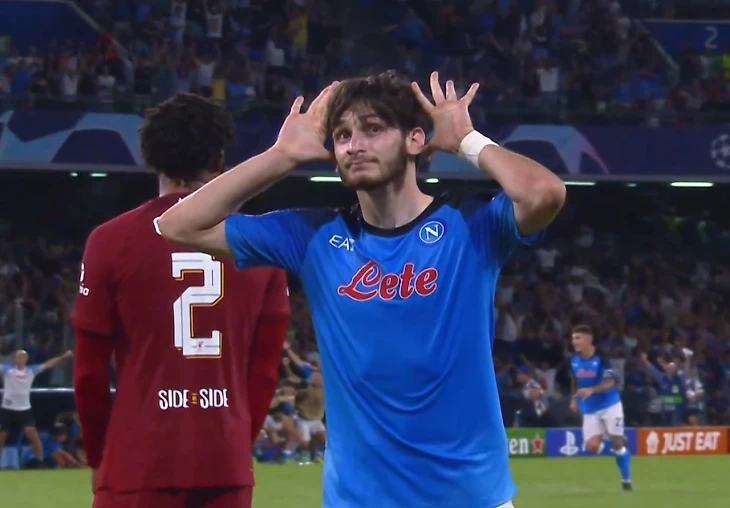 Прежде всего крут сам неополитанский клуб. Прекрасная атакующая линия, пополнившася Хвичей Кварацхелией или по-простому, по итальянскому, Кварадоной проявила себя ещё в серии А. И в этом матче, первом лигочемпионском для Квары, Наполи с первых же минут зажал гостей из Ливерпуля прессингом, что и привело к пенальти, исполненному Зелинским. Кстати, был и второй, но Осимхен не забил. В первом тайме Ливерпуля вообще не было на поле, хваленая оборона красных распалась на кусочки, а Хвича крутил и сажал на пятую точку Трента Александра-Арнольда, как юниора из ДЮСШ. Тут неплохо было бы сделать мем, как в свое время из углового Трента Барсе, - ответочка прилетела). Но если даже без национальных пристрастий, Хвича действительно был хорош сегодня, как и весь Наполи. Грузин отдал классную голевую на Джованни Симеоне, да-да сына тренера с железными яйцами, а тот забил свой первый гол в ЛЧ, в 27 лет, похоже на красивую сказку. Но именно она произошла сегодня в Неаполе. И как тут не вспомнить и не вставить свои 5 копеек про прошлогоднюю победу Спартака?))