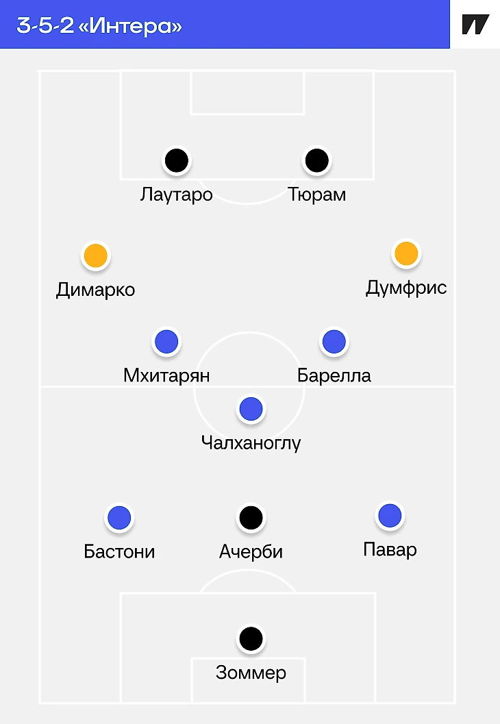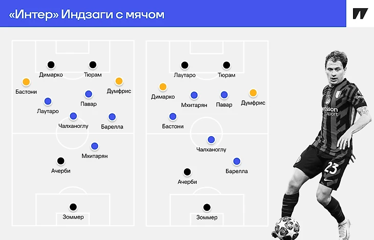 Приведем пример. Тюрам и Лаутаро – два нападающих. Они движутся так, как и положено паре девяток в схеме с двумя форвардами: по необходимости расширяют и сужают дистанцию между собой, открываются на разной высоте, цепляются за мячи спиной к воротам и т.п. Если «блуждающий» Бастони поднимется к ним, он станет дополнительным непредвиденным оружием, но если он окажется в атаке вместо, а не вместе с Тюрамом/Лаутаро, он теряет свободу и выполняет работу форварда.
