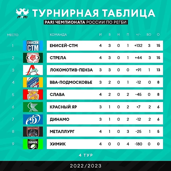 Представляем вашему вниманию турнирную таблицу PARI Чемпионат России по регби после 4-го тура сезона 2022/2023. Напоминаем, что ближайший матч наша команда проведет в Пензе в воскресенье, 14 августа. Игра состоится на стадионе "Первомайский"