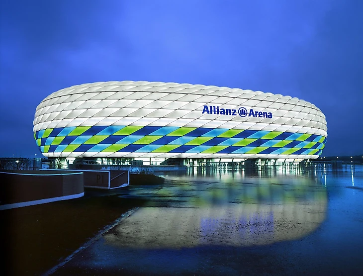 «Альянц Арена» - футбольный стадион, вмещающий от 70 до 75 тысяч зрителей. Иногда в шутку его называют «надувной лодкой», «автомобильной шиной» и даже «воздушной подушкой». Связано это с достаточно интересной формой. Фасад и крыша арены состоят из примерно 2,7 тысяч подушек, которые надуваются сухим воздухом и подсвечиваются синим, красным или белым.