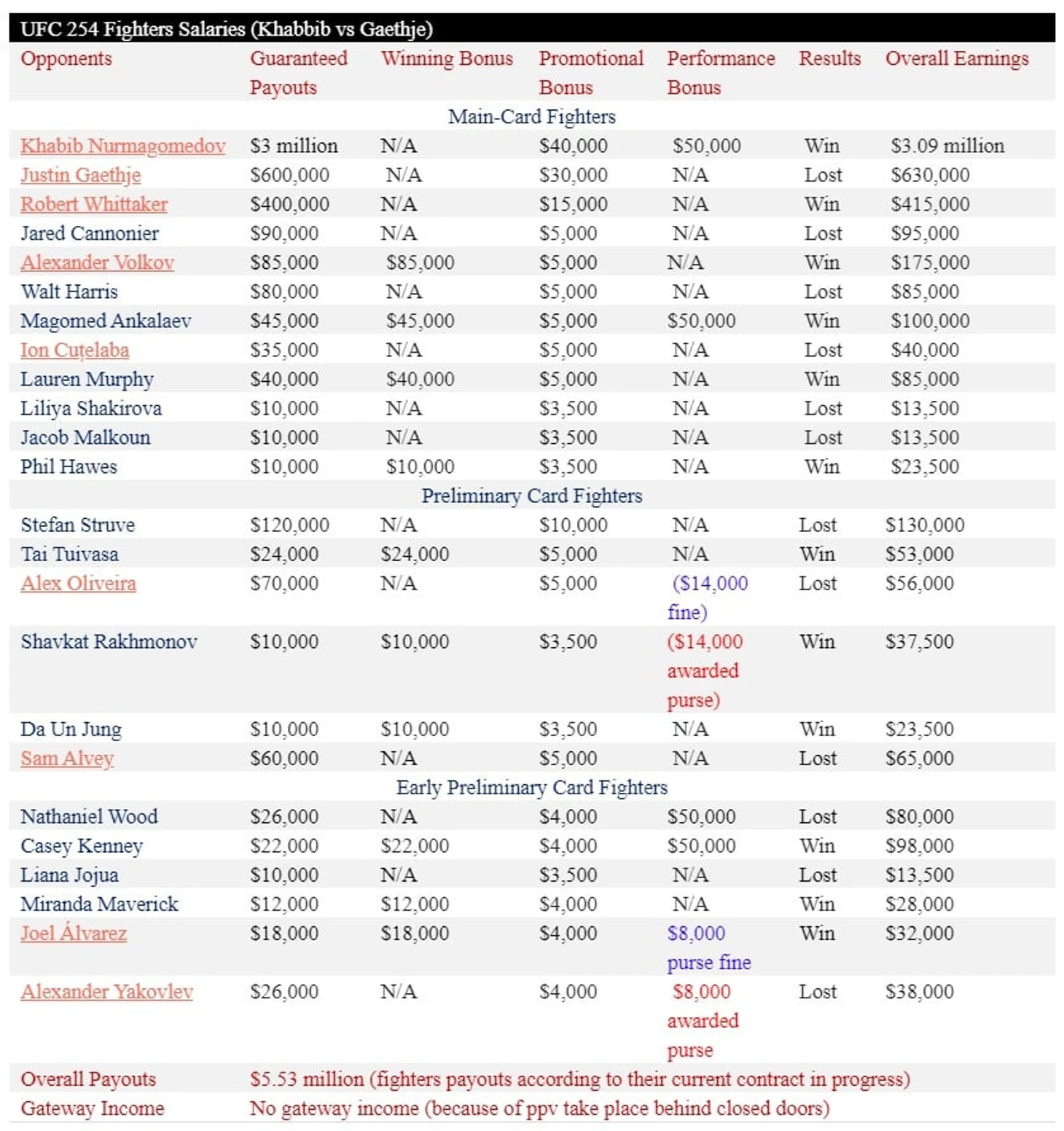 А вот данные по гонорарам остальных бойцов турнира UFC 254.