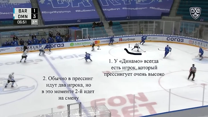 7. В целом «Динамо» очень высоко оборонялось во время позиционных атак «Барыса» – встречали хозяев еще до подхода к их синей линии, не говоря о собственной. В послематчевом интервью форвард «Динамо» Егор Шарангович объяснил, что команда старается играть подобным образом в каждом матче. В игре с «Барысом» данный аспект игры возымел просто убийственный эффект.