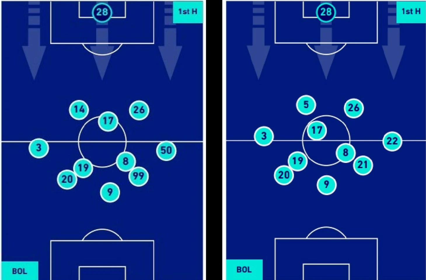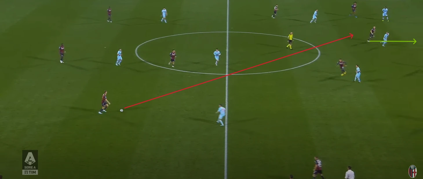 Рассмотрим ряд особенностей, которые являются фирменными в игре "Болоньи" при Тиагу Мотте, более детально. Розыгрыш мяча от ворот и выход из обороны Ключевое отличие по сравнению со "Специей" — функции вратаря при розыгрыше. Лукаш Скорупски проигрывает Ивану Проведелю в технике игры ногами. Тренер-догматик вроде Де Дзерби не стал бы мириться с этим и либо заставил поляка разыгрывать накоротке, либо попросил руководство купить ему более техничного вратаря. Мотта же подстроился под характеристики Скорупского и не стал требовать от него того, что Лукаш делает на недостаточно высоком уровне. Процент выполненных передач у Скорупского остается на уровне его прошлых сезонов. Лукаш практически безукоризненно пасует накоротке и на средние дистанции, а доля дальних выносов едва переваливает за 50%. При этом существенно повысился объем выполненных им оборонительных действий за пределами штрафной: 0,87 в среднем за игру. Этот показатель говорит о том, что вратарь и защитная линия действуют синхронно — когда защитники поднимаются выше, за ними следует и вратарь и, напротив, опускающаяся к своей штрафной защитная линия побуждает вратаря занять более традиционное положение близ собственных ворот. Автоматизация подобных взаимодействий помогает избегать разрыва между линиями: если защитники пустят соперника за спину, вратарь, находящийся в правильном положении, способен будет оперативно выдвинуться и нейтрализовать угрозу. В первом матче при Мотте — против "Эмполи" — "Болонья" пыталась выходить из обороны двумя способами: 1) за счет пасов от центральных защитников, Джона Лукуми и Штефана Поша; 2) используя перемещение крайних защитников, Лоренцо Де Сильвестри и Андреа Камбьязо, с фланга в центр, что позволяло получить ситуационное численное преимущество в этой зоне. Работало со скрипом, поэтому Мотта прибег к приему, ставшему в итоге фирменным для его команды в дальнейшем: Гари Медель, который при Мотте вернулся из центра обороны в опорную зону, стал опускаться низко, фактически на одну линию с центральными защитниками, и помогать им при розыгрышах. Эта функция чилийца — обязательный атрибут: команда, игравшая в рамках структуры 3-4-3, теперь чаще всего использует формацию 4-1-4-1, при этом Медель продолжает оставаться максимально глубинным опорным, почти третьим центрбеком. Решение же с крайними защитниками в роли центральных полузащитников болонцы порой вынуждены повторять. Так было, например, в матче с "Монцей", которая активно прессинговала центральных защитников и примкнувшего к ним Меделя, поэтому Мотта попросил левого защитника, Андреа Камбьязо, играть ближе к центру, где его не встречали. Это помогло "россоблу" справиться с давлением соперника. Также Мотта нашел новую роль для Штефана Поша: номинальный центральный защитник успешно играет справа в четверке. На его счету — победный гол в ворота "Торино" и в целом очень солидные перфомансы по сезону. Напрашиваются сравнения с Такехиро Томиясу: нынешний игрок "Арсенала" также переходил в "Болонью" центральным, а стал — правым защитником. На данный момент выборка не может быть репрезентативной, но уже бросается в глаза преимущество Поша в оборонительных действиях, в частности, в отборе мяча (более 68 % удачных попыток).