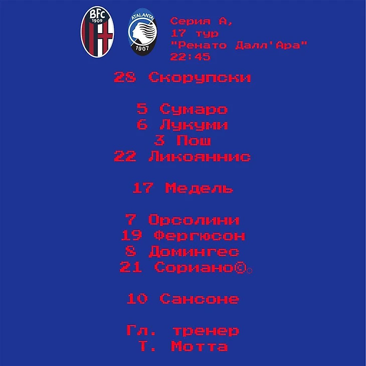 "Болонья" осталась без нападающих и то, как выйдет из положения Мотта, - очень интересно. Вместе с тем некоторые кадровые решения, которые принимает тренер, уже вызывают вопросы. Например, ситуация с Касиусом, который в последнее время не вызывается на матчи. Пишут, что идея тренера - перевести Камбьязо направо, таким образом образовав там конкуренцию с Пошем; слева будут играть новый левый защитник и его дублёр, Ликояннис. Зачем экспериментировать, когда есть живой, здоровый Касиус, который уже отдал 2 ассиста в этом сезоне и который является чуть ли не самым быстрым игроком БФК, остаётся загадкой. Так или иначе, эти рассуждения не имеют особого отношения к игре с "Аталантой": она будет сложной, но посильной.