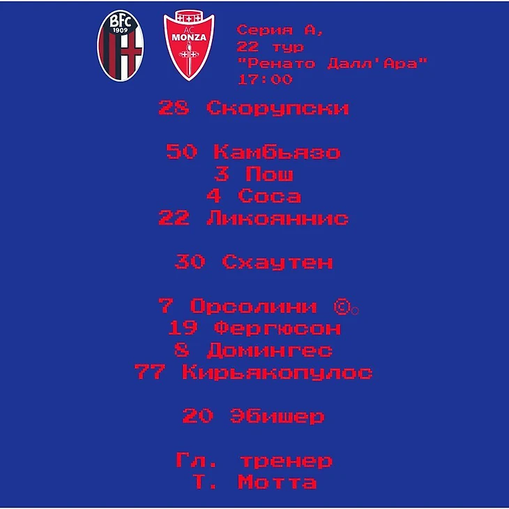 Состав Мотты, хоть и читался неоптимальным, все равно сумел удивить. Кирьякопулос и Ликояннис образовали связку на левом фланге; Пош стартовал в центре обороны, а Камбьязо начал справа. Эбишер вышел в центре полузащиты, а Фергюсон исполнял ложную девятку. "Болонья" стартовала очень бодро и поддавила гостей прессингом. Примерно до 15' монцези не помышляли об атаке. Хозяева, при этом, испытывали очевидные проблемы с конкретизацией владения мячом. Единственный момент "Болоньи" в первом тайме - перекладина после удара головой Ликоянниса. "Монца" сумела забить, воспользовавшись нерасторопностью Хоакина Сосы. Защитник "Болоньи" проиграл борьбу Петанье, который вышел на оперативный простор и пробил. Мяч рикошетом от Скорупского пришел к Джулио Донати, расстрелявшему пустые ворота. Второй тайм - и владение "Болоньи" стало более подавляющим, но не стало более опасным. Хозяева стремились атаковать флангами, но получалось скверно: слева прилетали безадресные навесы греков, справа активен был Орсолини, - но, опять же, без особых проблем для "Монцы". Тиагу Мотта бросил в игру Барроу и Арнаутовича, но переломить ход встречи и взломать оборону брианцев у находящихся не в оптимальных кондициях нападающих БФК не вышло. "Болонья" проигрывает: команда старалась вести игру, но не хватило класса в атаке. "Монца" выглядела командой, которая относится к происходящему со знанием дела; БФК же так и не смогли наладить игровые связи в рамках сегодняшнего неоптимального состава.