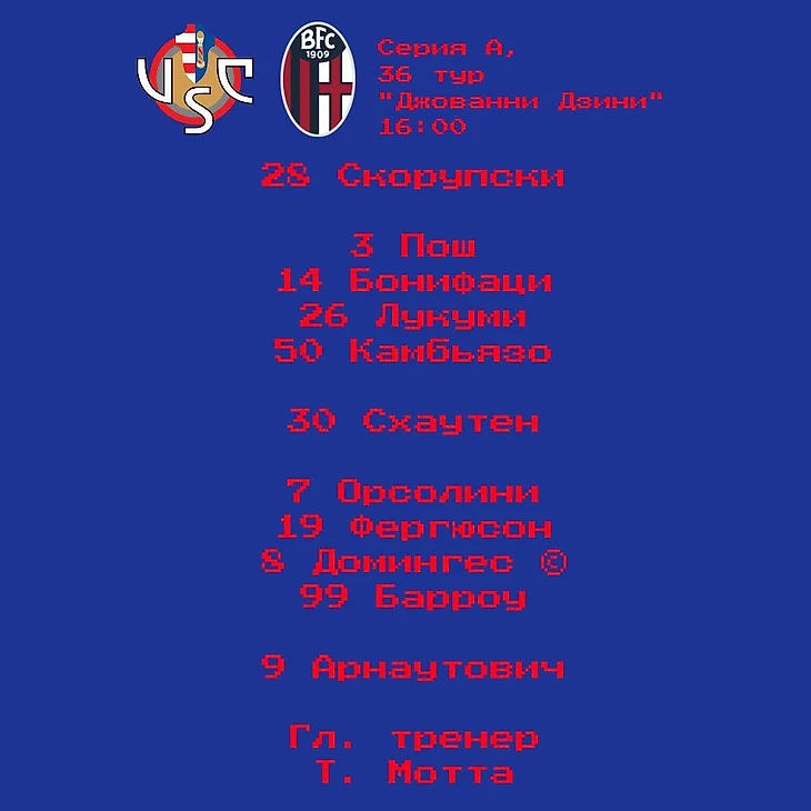 По сравнению с составом на "Рому" - лишь 2 замены: вернувшийся после дисквалификации Пош занял свое место справа в четверке, Лукуми стартовал в центре вместо Хоакина Сосы. В центре нападения - вновь Марко Арнаутович. "Болонья" доминировала первые 40': к традиционному для себя владению добавились обострения и удары. Много ударов. 12-1 по итогам первого тайма - и 3-0 в пользу команды Мотты. Сначала "Россоблу" здорово изолировали Барроу на левом фланге, и после прострела гамбийца головой забил Арнаутович - впервые с ноября. Далее - два гола с угловых: Фергюсон забил после сутолоки в штрафной, Пош попал головой после того, как по мячу промахнулся Карнесекки. Оба раза подачу с угла исполнял Орсолини, который тоже был близок к голу, но всякий раз его ударам не хватало точности. Второй тайм для "Кремонезе" становился вопросом выживания. Команда Баллардини, которую тренер взбодрил заменами, забегала и явно чаще стала угрожать воротам Скорупски. В одном из эпизодов судья Валери свистнул пенальти за игру рукой Бонифаци, но после просмотра ВАР отменил решение: защитник БФК выбивал мяч плечом. "Болонья", в свою очередь, могла - и смогла - забить еще. Отбившись от углового, команда Мотты идеально вышла из обороны, а получивший пас от Камбьязо Орсолини переиграл Карнесекки. Орсолини отметился также со знаком минус, удалившись за вторую жёлтую. Несмотря на численное меньшинство, красно-синие не только не выпустили нити игры, но и добавили пятый: Барроу на Сансоне - и "Кремонезе" с оглушительным треском прощается с Серией А, сумев напоследок забить лишь однажды усилиями Чиофани. "Болонья" сумела прибавить в конкретике, насадив на владение мячом также и остроту обращения с ним. Команда побеждает впервые с 8 апреля и делает это в превосходном стиле. Единственно возможный для футбольной команды подарок народу Эмилии-Романьи во время трагедии.