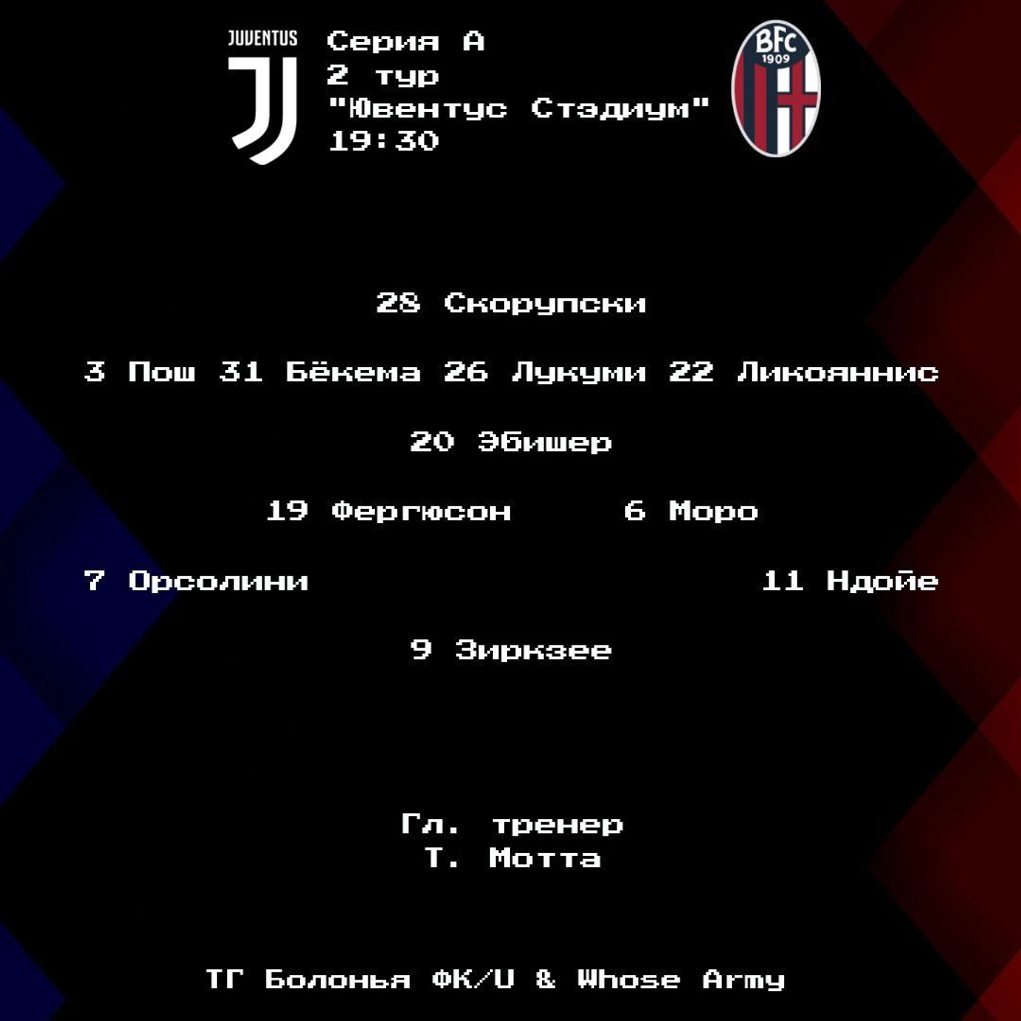 Читал интересное мнение о том, что на игровой философии "Ювентуса" весьма положительно сказывается приход в клуб Франческо Маньянелли. Легенда "Сассуоло" и многолетний проводник идей Ди Франческо/Де Дзерби на поле и в раздевалке эмилианцев, этот специалист помогает Аллегри привить "Старой Синьоре" новую сложную философию: контроль мяча с частой сменой позиций в центре поля. Задатки нового курса туринцев явственно прослеживались в игре 1 тура с "Удинезе". Вчера же, особенно в первом тайме, мы не увидели ничего нового: старый-добрый нелогичный "Юве", который конвульсировал от зачаточных попыток контроля до прямолинейных дальних забросов на ход - почти всегда неудачных. Мотта не лукавил на предматчевой пресс-конференции: его команда готова была реагировать и, когда надо, отказываться от владения. Терпеть приходилось много - особенно в начале второго тайма, когда хозяева поля вжали БФК в их штрафную. Добиться этого помогли ходы Аллегри: в частности, Кьеза вернулся на родной левый фланг, откуда со скоростью гепарда стартовал по направлению к штрафной "Россоблу". Отмечаем также необычные роли Веа и Камбьязо: именно американец чаще сваливался в центр. От экс-игрока "Фельсинеи" мы этого коронного приема так и не дождались. "Болонья" была хороша в обеих фазах, но в то же время будто не дожала, не извлекла выгоду из ряда ситуаций. При владении моментов почти не было: самые опасные моменты БФК создала, агрессивно вступая в отбор и забирая мяч на чужой половине поля. Шансы Ндойе и Моро в 1Т пришли как раз после удачных прессинг-действий на чужой. Гол Фергюсона, хоть и пришел после владения, был следствием, скорее, вертикальной атаки, нежели тщательно подготовленной позиционки. Мотта все же отказался от инвертированных вингеров: Орсолини стартовал слева, Ндойе - справа. Особых преимуществ команде это не дало: отмечаем лишь уровень Ндойе, который, как и в первом туре, изрядно напрягал соперников на протяжении всей встречи и фактически выключил из игры Камбьязо. Орсолини со своими оборонительными задачами тоже, скорее, справился: в паре с Ликояннисом вынуждали Веа искать счастья в центре поля. Выдающийся матч провели Бёкема, Эбишер и Зиркзее: последний оформил красивую голевую передачу, как под копирку повторив хитрый пас на ход партнеру образца матча с "Миланом". Естественно, главное, что обсуждают сейчас, - это эпизод с неназначенным пенальти за фол Айлинга на Ндойе во 2Т. О нем крайне жёстко высказался Фенуччи: первый случай на моей памяти, когда подобные заявления БФК не постеснялась выложить в соцсети на всеобщее обозрение. Самый достоверный источник новостей о "Россоблу", Zerocinquantuno, объявил о том, что приостанавливает свою деятельность на 24 ч в знак несогласия с произволом. Мотта же отказался отвечать на вопрос о судействе, просто похвалив своих парней за самоотдачу. Я, со своей стороны, признаюсь: ненавижу говорить о судействе, даже таком вопиющем. Глубоко убежден, что отдельный футбольный матч всегда заслуживает того, чтобы не вспоминать о рефери и их решениях. Ди Белло не увидел фола Айлинга в штрафной. Спустя несколько минут Айлинг выполнил великолепный голевой пас. Очередной случай, когда справедливость и ирония не смогли договориться.