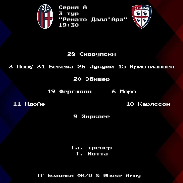 Случается нечасто, и потому ещё более удивительно: мы полностью предсказали состав, в отличие от газет, которые в старте рисовали Калафьори, а не Кристиансена. Преимущество БФК в первом тайме было ощутимым, и, как это часто бывает, не материализовалось в голы. Несмотря на соотношение ударов 6 к 1 и владения 80 на 20 %, именно подопечные Раньери забили первыми: отличился бодрый краек Лувумбо. В конце тайма вратарь сардов Радунович совершил впечатляющее двойное спасение: казалось, что и удача сегодня на стороне гостей. Не тут-то было: Мотта сумел подобрать правильные слова в раздевалке: думаю, что-то из разряда "Играйте, как играли, вы все делаете правильно." На излёте 59 минуты в результате флангового розыгрыша отличился Зиркзее, которому классно ассистировал новичок Кристиансен: первый звоночек для Радуновича, который пропустил простой удар в ближний. "Болонья" увеличила давления и добилась права пробить пенальти. К точке подошёл Орсолини - и впервые в карьере не забил с 11 метров. Хорошо, что в этой команде подобраны классные резервы на случаи тяжёлых сценариев. Вышедший на замену Джованни Фаббиан забил потрясающий по своей курьезности гол (Радунович уронил мяч на ногу болонскому янгстеру после удара Кристиансена ножницами), который оказался победным: времени отыграться у гостей не было. Как и предполагалось, тяжеленный матч с соперником, который умеет и закрываться, и контратаковать. В итоге "Болонья" сумела победить, потому что её доминантный стиль позволяет генерировать шансы - и, поскольку состав подобран сильный, шансы эти должны и будут конвертироваться в голы.