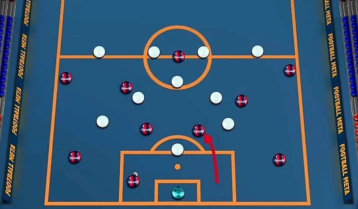 Центральные защитники в начальной фазе атаки располагаются справа и слева от вратаря, соответственно. Как только один из них получает мяч, второй сразу же поднимается выше, в опорную зону. Это одно из ключевых отличий в построении билдапа в сравнении с прошлой кампанией, где в опорную зону слева сваливался Камбьязо.
