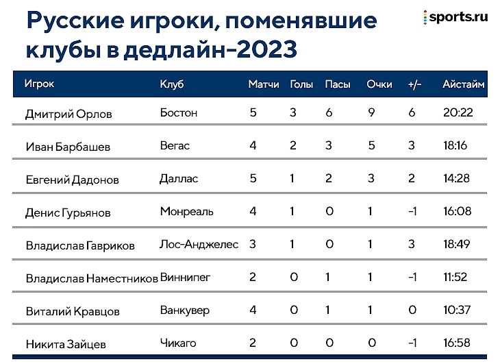 Вообще поражает то, как быстро адаптируются в новых командах российские игроки, которых обменяли в последний месяц. Уже пятеро из них забросили хотя бы одну шайбу, а Дмитрий Орлов вообще решил потягаться с Давидом Пастрняком в списке бомбардиров. Даже Гурьянов забил, хотя в «Далласе» у него за 43 игры было только 2 шайбы.