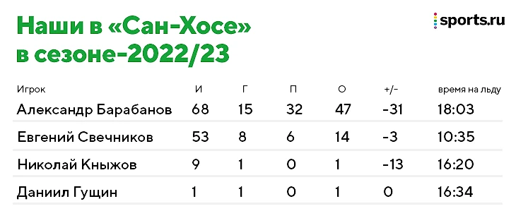 Даниил в итоге провел на льду 16:34 и стал четвертым русским игроком в составе «Шаркс» в этом сезоне. Столько же наших сыграли за «Рейнджерс» (Шестеркин, Панарин, Кравцов, Тарасенко), «Тампу» (Василевский, Сергачев, Наместников, Кучеров), «Вашингтон» (Овечкин, Кузнецов, Алексеев, Орлов), «Коламбус» (Тарасов, Гавриков, Чинахов, Марченко) и «Ванкувер» (Кузьменко, Подколзин, Михеев, Кравцов). А лидирует «Сент-Луис»: Тарасенко, Барбашев, Бучневич, Торопченко и Александров. Но Тарасенко там теперь нет.