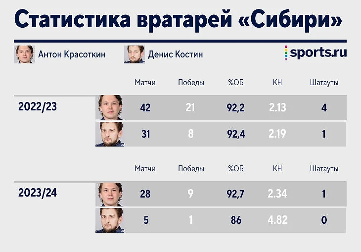 Очевидно, что в Костина не верят, а Красоткина скоро загонят: он провел 28 матчей – больше чем кто-либо из вратарей в лиге. До матча с «Сочи» у «Сибири» было три поражения подряд с ним – в общем, опытного 37-летнего голкипера берут в клуб как нового бэкапа, одного мастерства Красоткина не всегда хватает. А о том, что Худобин будет не основным, говорит хотя бы тот факт, что неделю назад новосибирцы продлили контракт с Красоткиным до 2026 года.