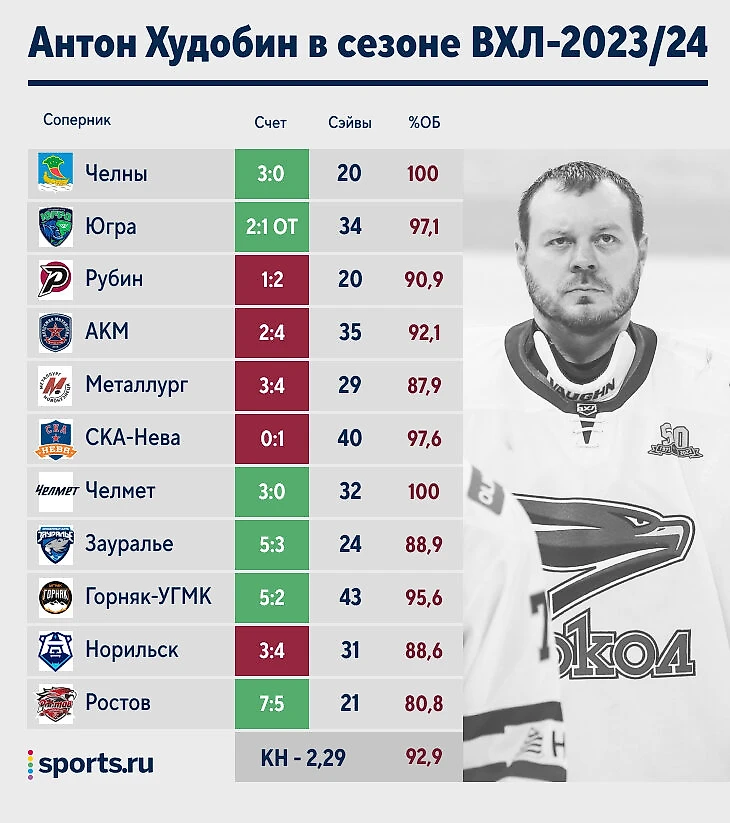 В итоге 4 сентября «Сокол» объявил о подписании Худобина. По сути, топ-клуб ВХЛ, финалист-2023, подписал топ-вратаря – как минимум по меркам этой лиги. Забавно, что новым боссом Антона стал Александр Семин, с которым они вместе играли в «Каролине». Бывший нападающий – сейчас президент красноярского клуба.