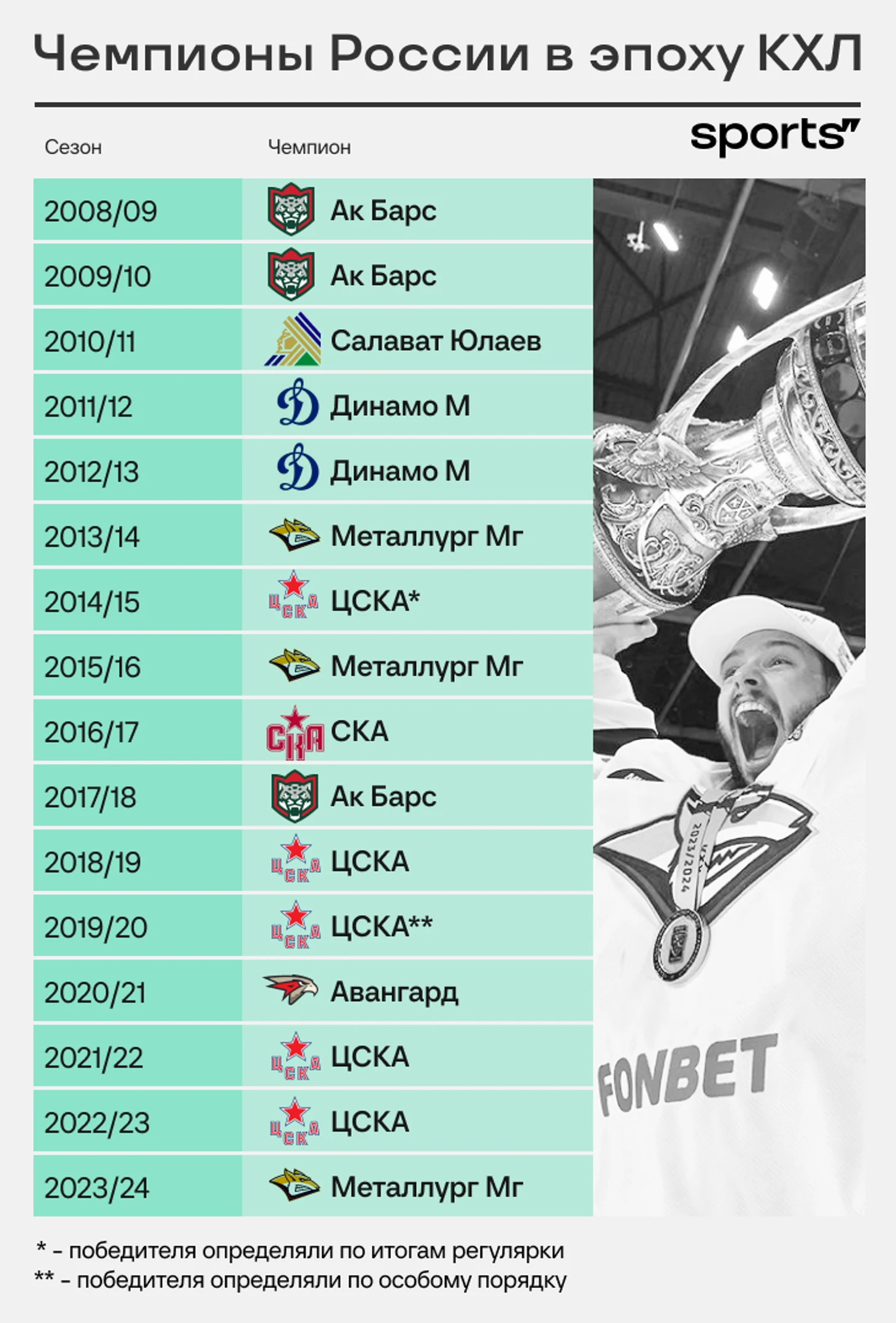 В итоге КХЛ получила право на определение чемпиона страны, взяв в пример формат той самой МХЛ. Лучшим клубом России признавалась команда, которая дальше всех пройдет в плей-офф. Исключением стал сезон-2014/15, когда победителя назвали по итогам регулярки. Тогда больше всех очков набрал ЦСКА (139).
