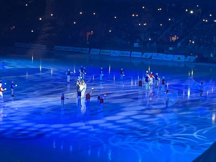 Болельщики к тому моменту заполнили трибуны и подсветили арену. Организаторы не обманули – действительно аншлаг.