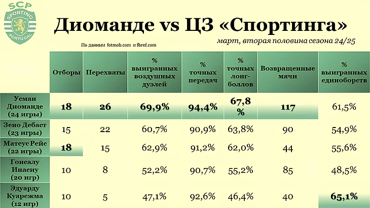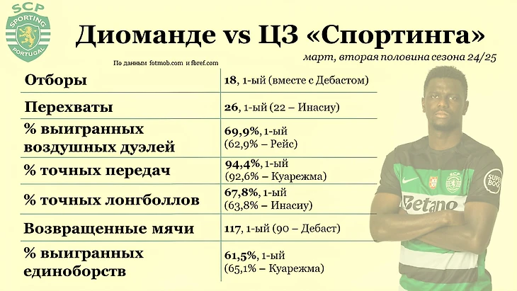Перемещаемся в март-2025. Диоманде захватил лидерство в еще большем количестве статистических показателей среди защитников «Спортинга». Теперь он первый по количеству точных передач за игру, отборов, перехватов, выносов, заблокированных ударов и нескольким другим интересным метрикам.