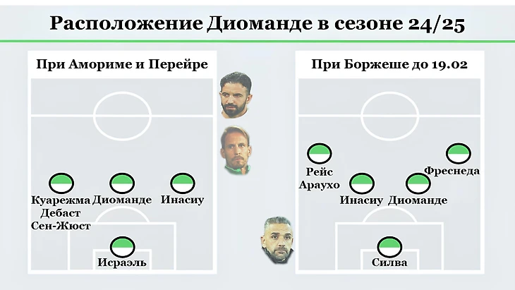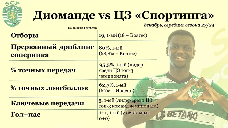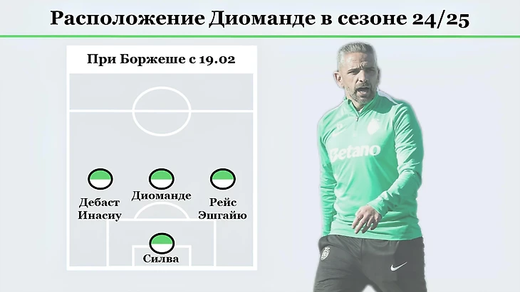 Правда, при новом тренере Руе Боржеше «Спортинг» сначала перестал играть с тремя ЦЗ –Диоманде выходил правым центральным защитником в 4-4-2 или 4-2-3-1.