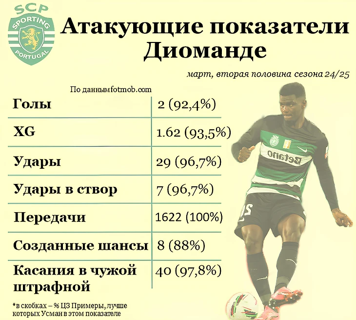 Диоманде – безальтернативно первый выбор на место центрального защитника и для Руя Боржеша сейчас, и для Жоау Перейры с Рубеном Аморимом чуть ранее. В сезоне-24/25 Усман в топ-5 команды по сыгранным минутам, и пропустил всего 6 матчей во всех турнирах (3 из них – из-за травмы лодыжки в октябре).