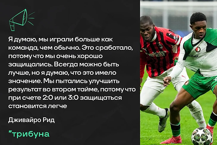 Та февральская неделя выдалась для Рида просто потрясающей – в ответной игре с «Миланом» оформил 7 отборов и помог команде пройти дальше, а на выходных принес победу «Фейеноорду» двумя голевыми передачами в матче с «Альмере» (2:1).