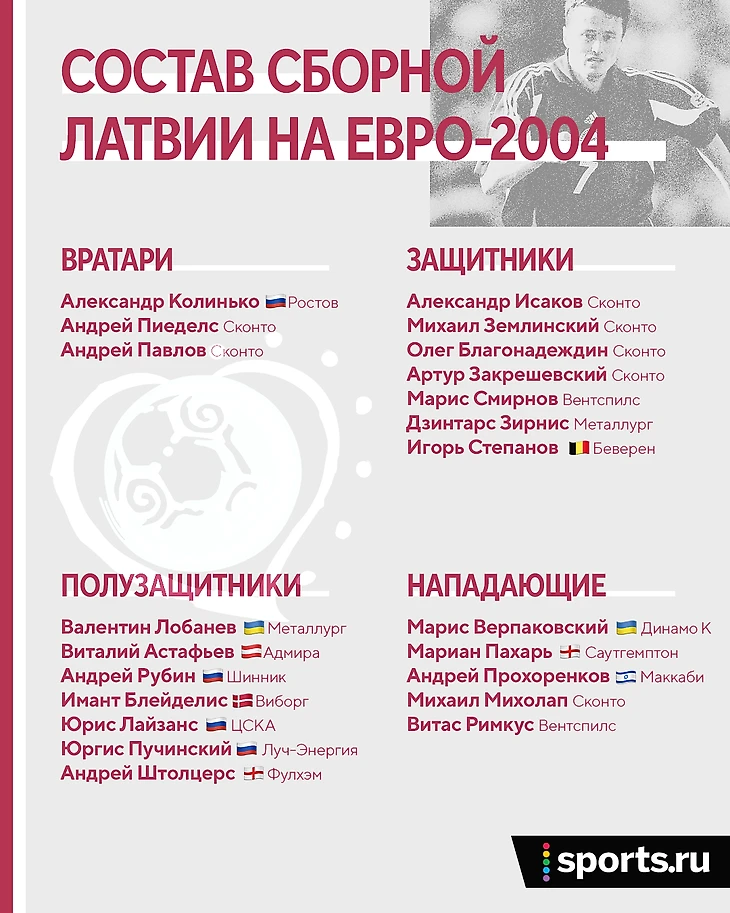 Много футболистов представляли российский чемпионат: Александр Колинько из «Ростова», Олег Благонадежин из «Алании», Юрис Лайзанс, который точно был не последним игроком ЦСКА. Еще были Владимир Колесниченко из «Москвы» и Андрей Рубин из «Шинника», который позже оказался в «Спартаке». Главным же талантом Латвии-2004 был Марис Верпаковскис – он забил больше всех голов в отборе (4) , а потом положил единственный мяч сборной на Евро – открыл счет в матче с Чехией. Тогда он выступал за латвийский «Сконто», а затем его карьера пестрила неожиданными клубами: киевское «Динамо», «Хетафе», «Сельта», «Хайдук», «Баку». Правда, на момент Евро казалось, что Верпаковскис способен и на большее.
