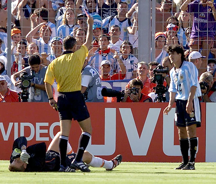 Он не вернулся в Валенсию после новой вылазки в сборную и к чемпионату мира готовился в Буэнос-Айресе, бегая по утрам в парке Палермо. Пассарелла взял его во Францию – не мог не взять после завораживающего гола Ирландии. Ортега увидел над собою синее небо, такие белые облака на голубом, забил два из пяти мячей Ямайке, громче всех спел в автобусе «¡Vamos, vamos, Argentina!» после победы над Англией в 1/8, начал голевую атаку в четвертьфинале с Голландией, а за три минуты до конца, при счете 1:1, наткнулся на Япа Стама и упал. Это пенальти, подумал Ортега, услышав свисток, но, подняв голову, увидел орущего ван дер Сара и судью Картера с желтой карточкой. Вскочив, Ариэль боднул ван дер Сара («Он упал так, будто я выстрелил в него из базуки», – сказал Ортега в интервью Clarín), и Картер достал красную. Ариэль добрел до раздевалки и услышал рев трибун. «Кто забил?» – спросил он стюарда. – «Голландия».