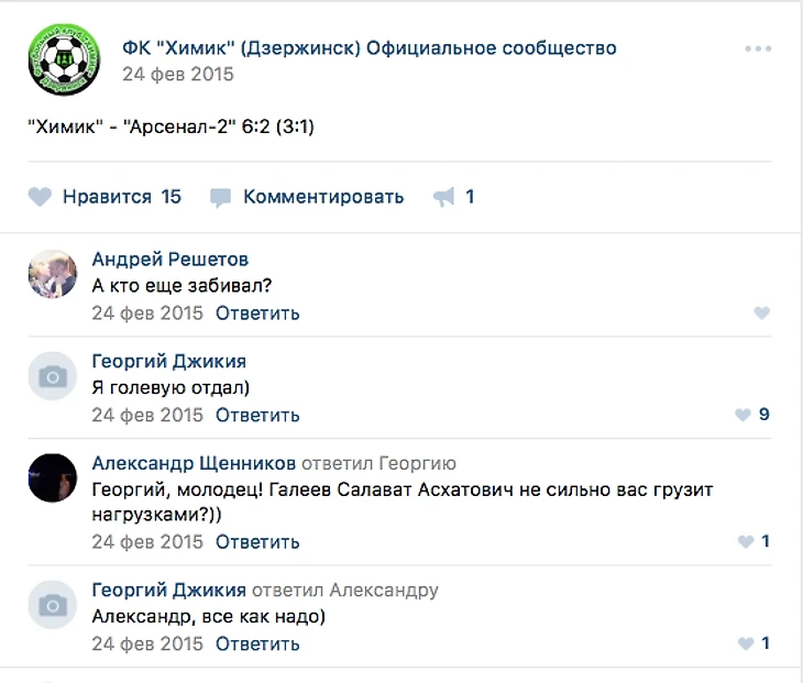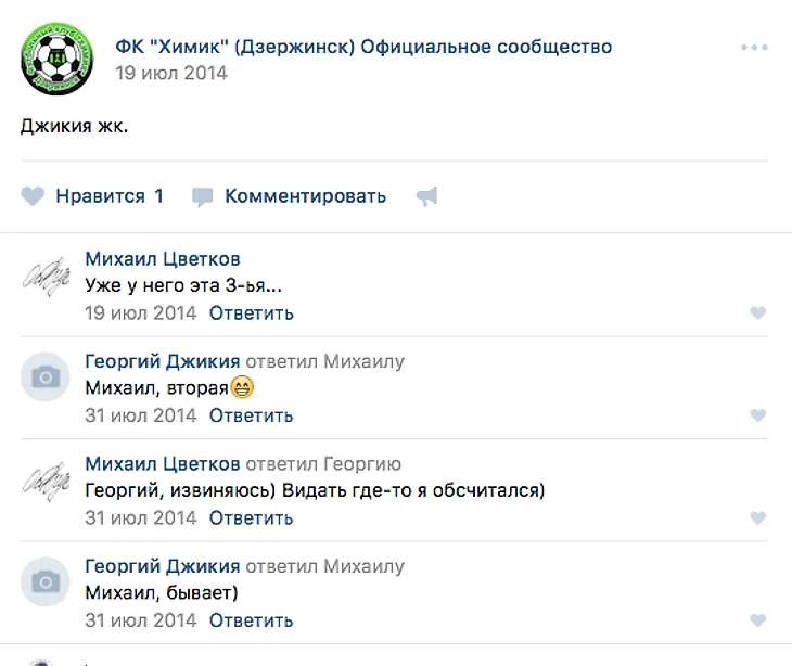 «Мы решили, что нечего заморачиваться, перестраиваться на другой часовой пояс и прилетать за день до игры. Поспим в самолете и прямо из аэропорта поедем на игру, – говорит Харлачев. – В итоге, прилетев, чувствовали себя нормально и победили». Через девять минут после стартового свистка «Химик» забил победный гол с паса Джикии. В предыдущей игре, с хабаровским СКА, Георгий получил желтую карточку, а потом внес важное уточнение в группе болельщиков «Химика» Вконтакте.
