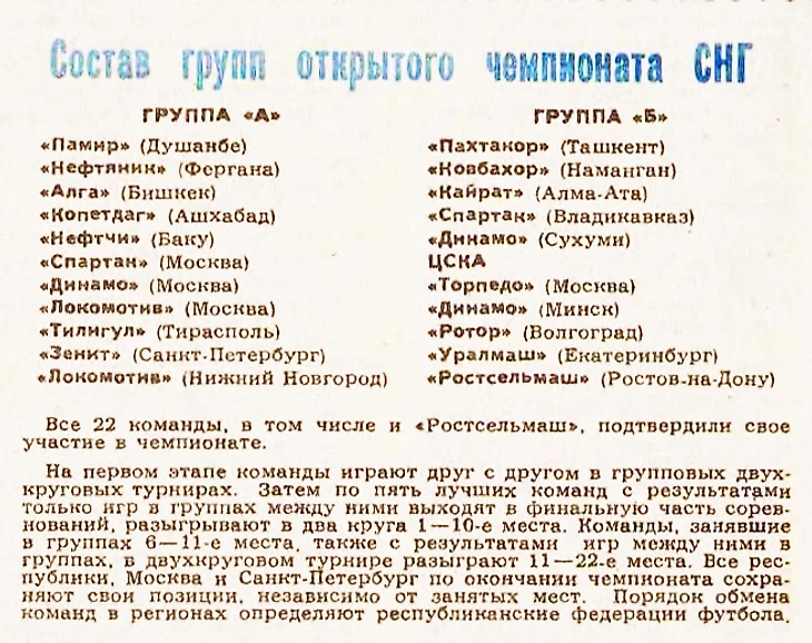 В начале 1992-го Федерацию футбола СССР преобразовали в Ассоциацию федераций футбола СНГ. Ее босс Вячеслав Колосков заявил на январском пленуме: «Скоро все республики обретут реальный суверенитет, но в ближайшие 2-3 года надо сохранить старые связи и проверенную структуру чемпионата».