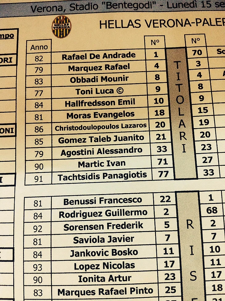 В общем, в предматчевом ролике было на что посмотреть – забивал всегда более-менее один Лука Тони, а вот имена его ассистентов навевали на болельщиков ностальгию: Жоржиньо, Ромуло, Итурбе, Мартиньо. Никого из них в «Вероне» уже нет, но спортивный директор клуба Шон Сольяно подыскал им недурственную замену: вернул в Верону Тахцидиса (именно на «Бентегоди» он несколько лет назад очаровал Зденека Земана, заработав контракт с «Ромой»), купил вдобавок к бразильскому Рафе Маркесу мексиканского, арендовал в «Монако» резвого марокканца Мунира Оббади, который теперь ведет игру команды в середине, за копейки привлек двух лучших нападающих молодежных чемпионатов мира (2001-го – Савиолу, и 2013-го – Нико Лопеса), по свободному трансферу взял талантливого правого защитника из Швейцарии Ивана Мартича, год назад не пустившего в Лигу Европы «Спартак», ну и усилил греческую диаспору в клубе Лазаросом Христодупо... Христополу... Короче, прочитайте его фамилию сами – он под номером 20.